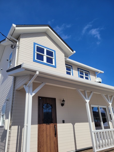 青空が映える、爽やかなホワイトの外観にカバードポーチ