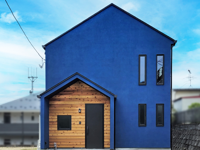ブルーのラップサイディングが目を引く、カルフォルニアスタイルの外観。スケルトンのリビング階段のあるLDKと塗り壁で仕上げた白い壁に木目調の天井と木目の表情豊かなアカシアの無垢材の床が映える空間が特徴的です。