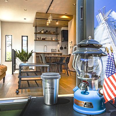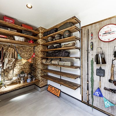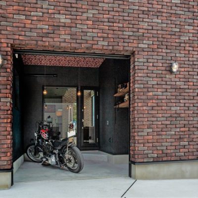 ガレージ部分の外壁はブリックタイルのアクセント。天井や照明にも遊び心を取り入れて、ハーレーがよく似合う、かっこいい空間に仕上がっています。パントリー、階段下収納など、生活動線を意識した収納も充実。眺望を楽しめるよう、大きな窓と吹き抜けを設けたリビングには、光と開放感が広がります。