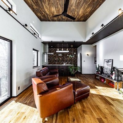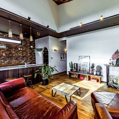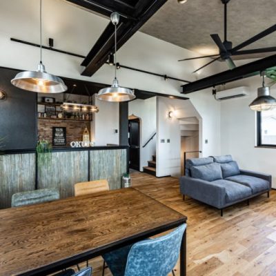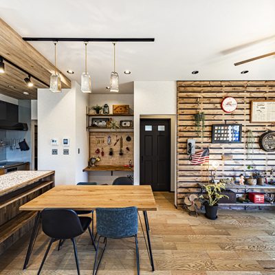 外観はオリジナル塗装を施したマットブラックの外壁に、重厚感のあるブリックタイルを組み合わせた無骨な印象に。平屋ならではの大きな窓から日差しが差し込む、開放的な勾配天井のLDKと天井やキッチンのアクセントクロスでかっこよく仕上げた男前インテリアがポイントのお家です。