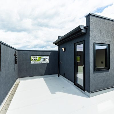 ガルバリウムと塗り壁を組み合わせた外観、キッチンの天然石を切り出したアクセントウォールはインダストリアルミックスのデザインとマッチして、空間を引き立てます。さらに、屋上リビングとして活用できるルーフバルコニーもポイントのひとつ。