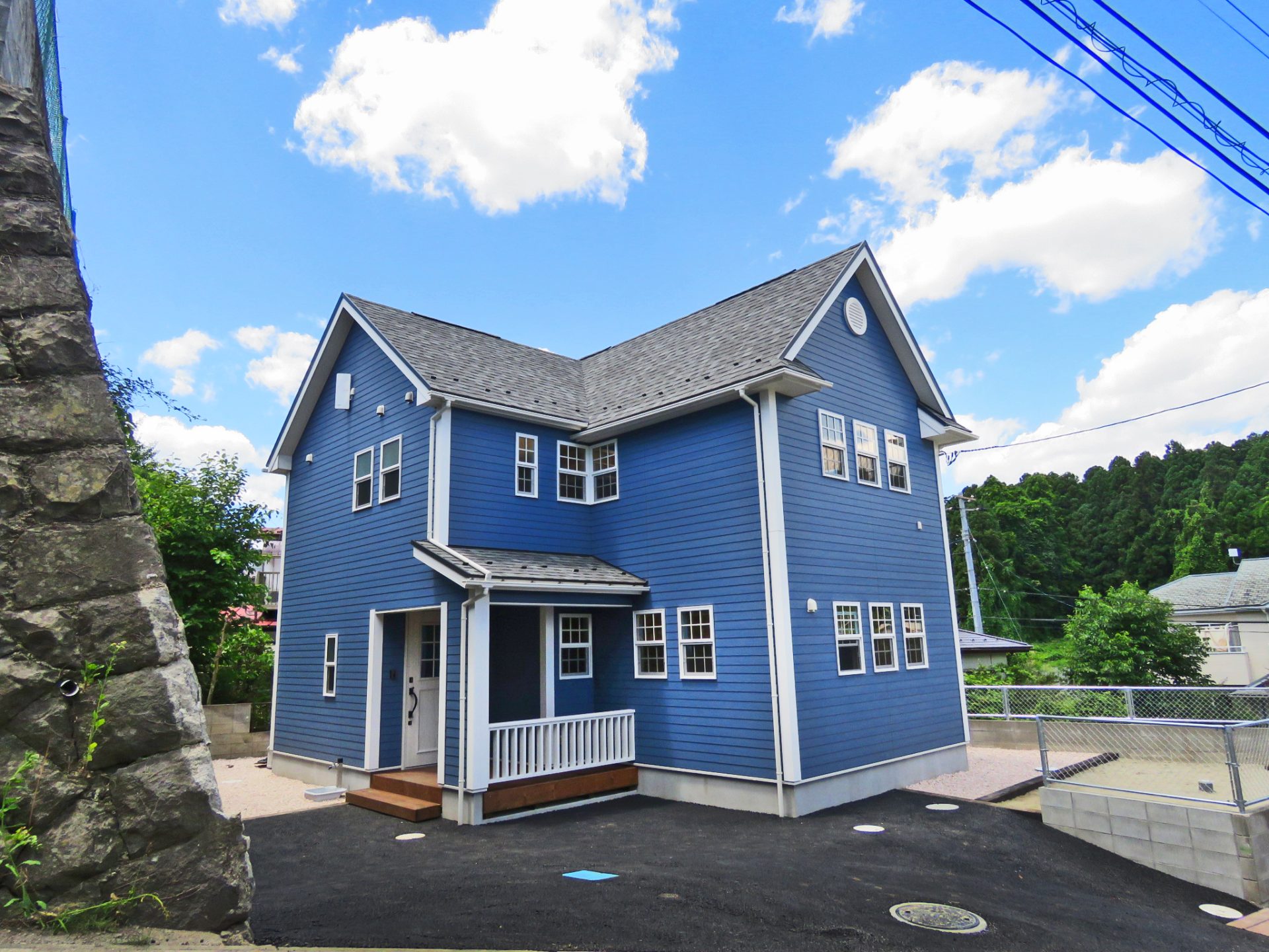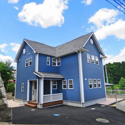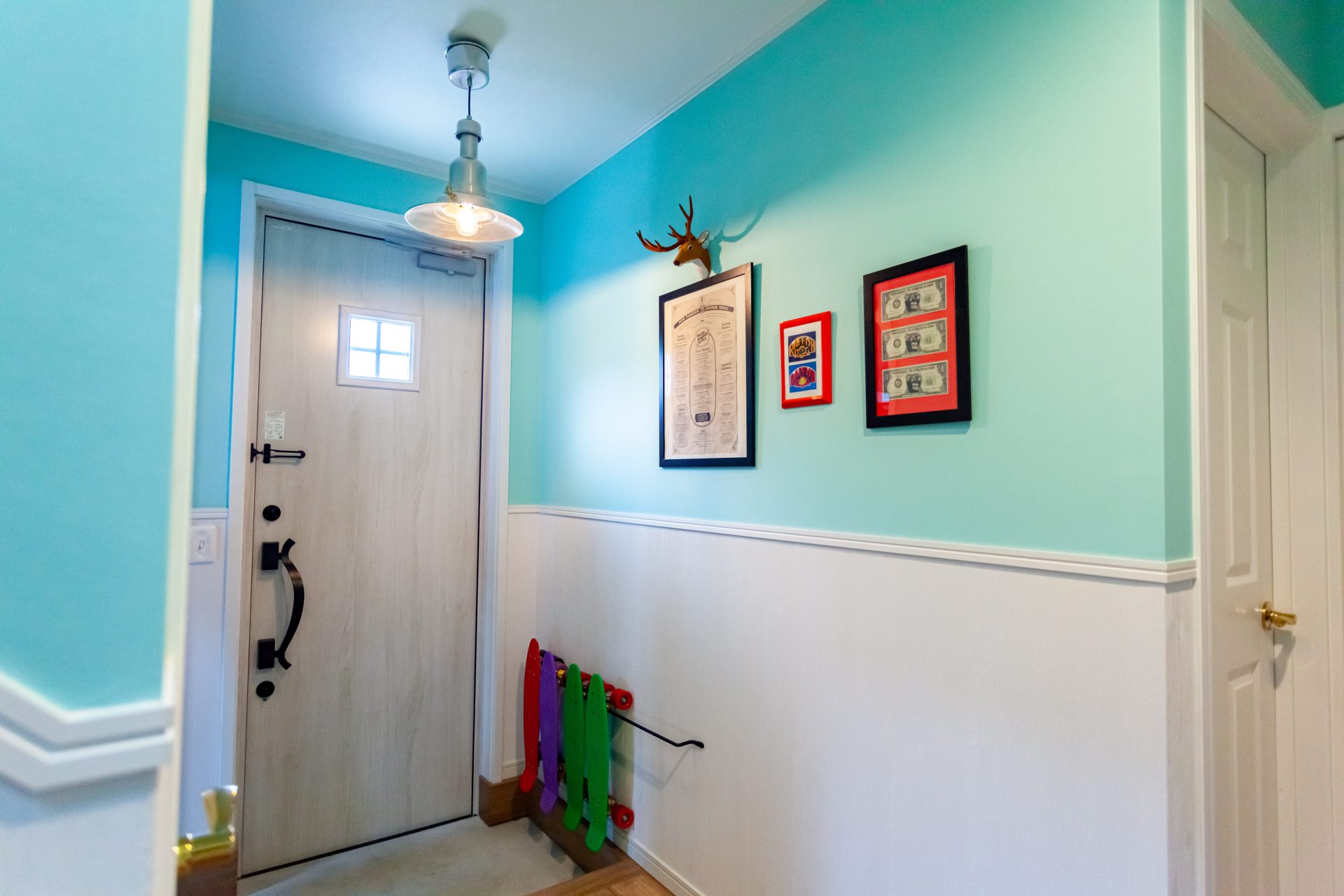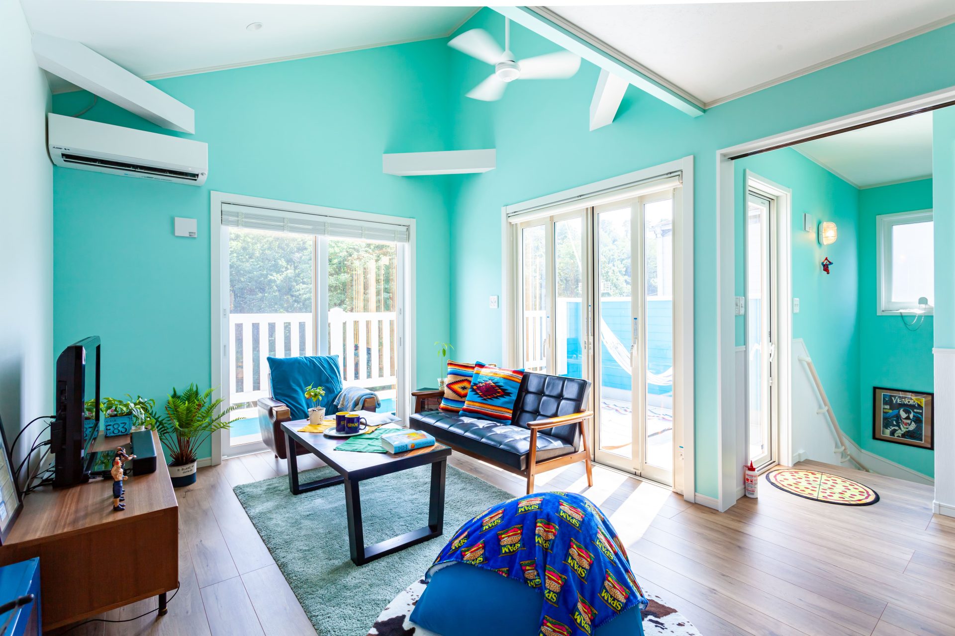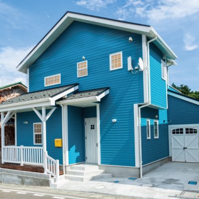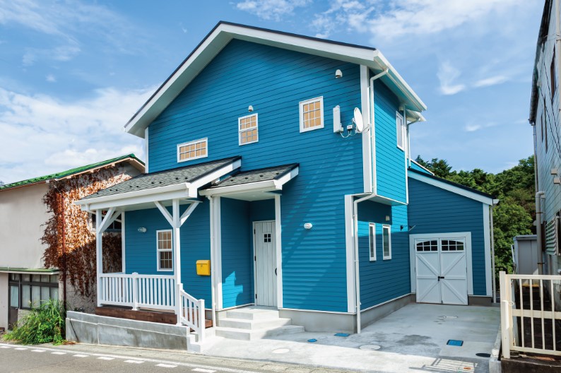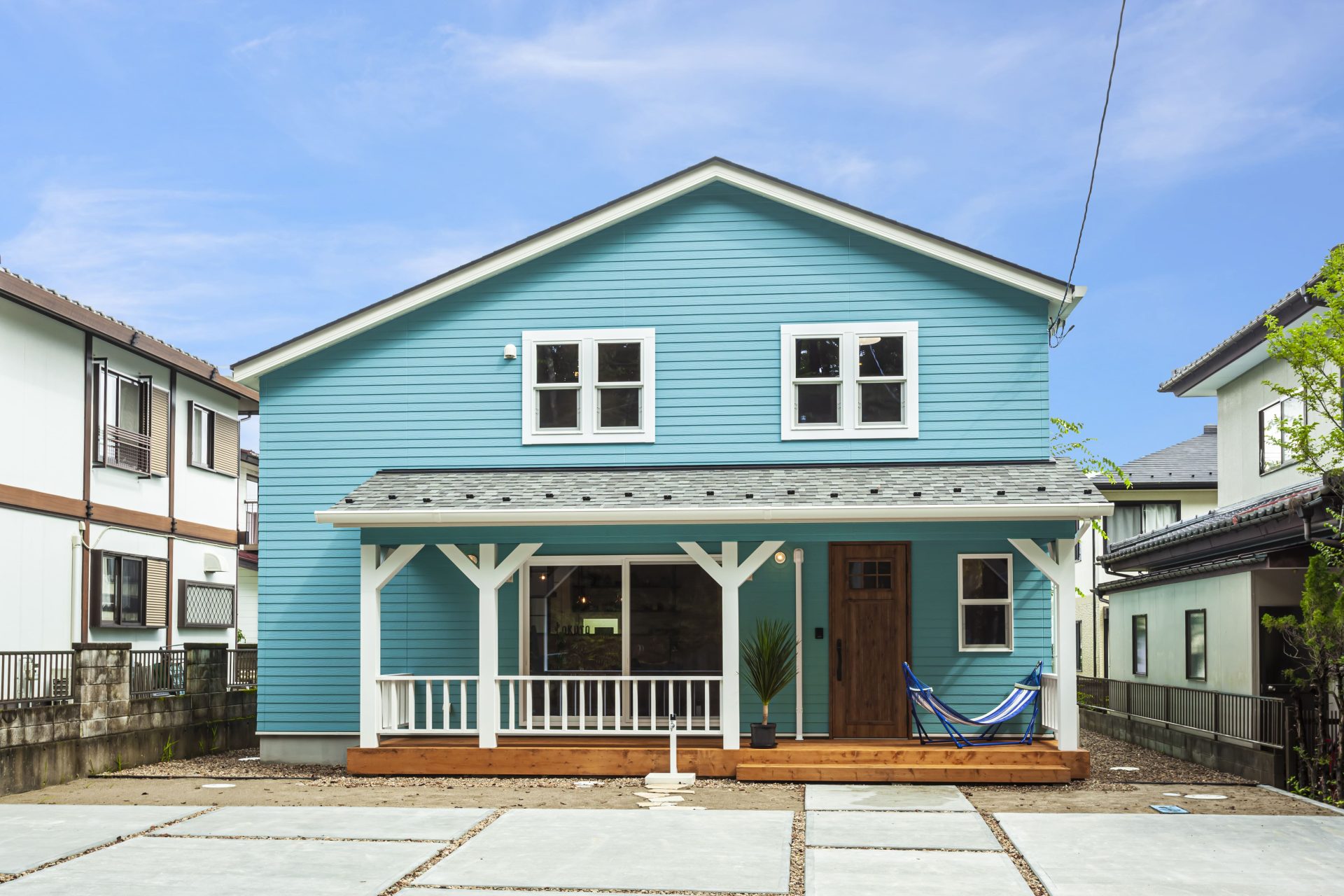 こだわりBlueのラップサイディングに白いカバードポーチが特徴的な外観。お客様ご希望のバイク用インナーガレージがかっこいいアメリカンハウス。バルコニーに繋がる大きな窓とミントブルーの壁で明るく開放的な2階LDK。大好きなアメリカンアイテムでコーディネートして自分たちだけのお気に入りの空間に。