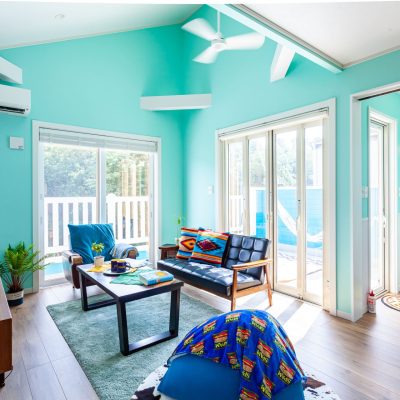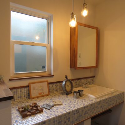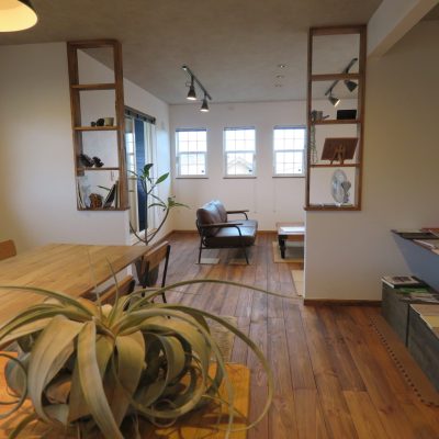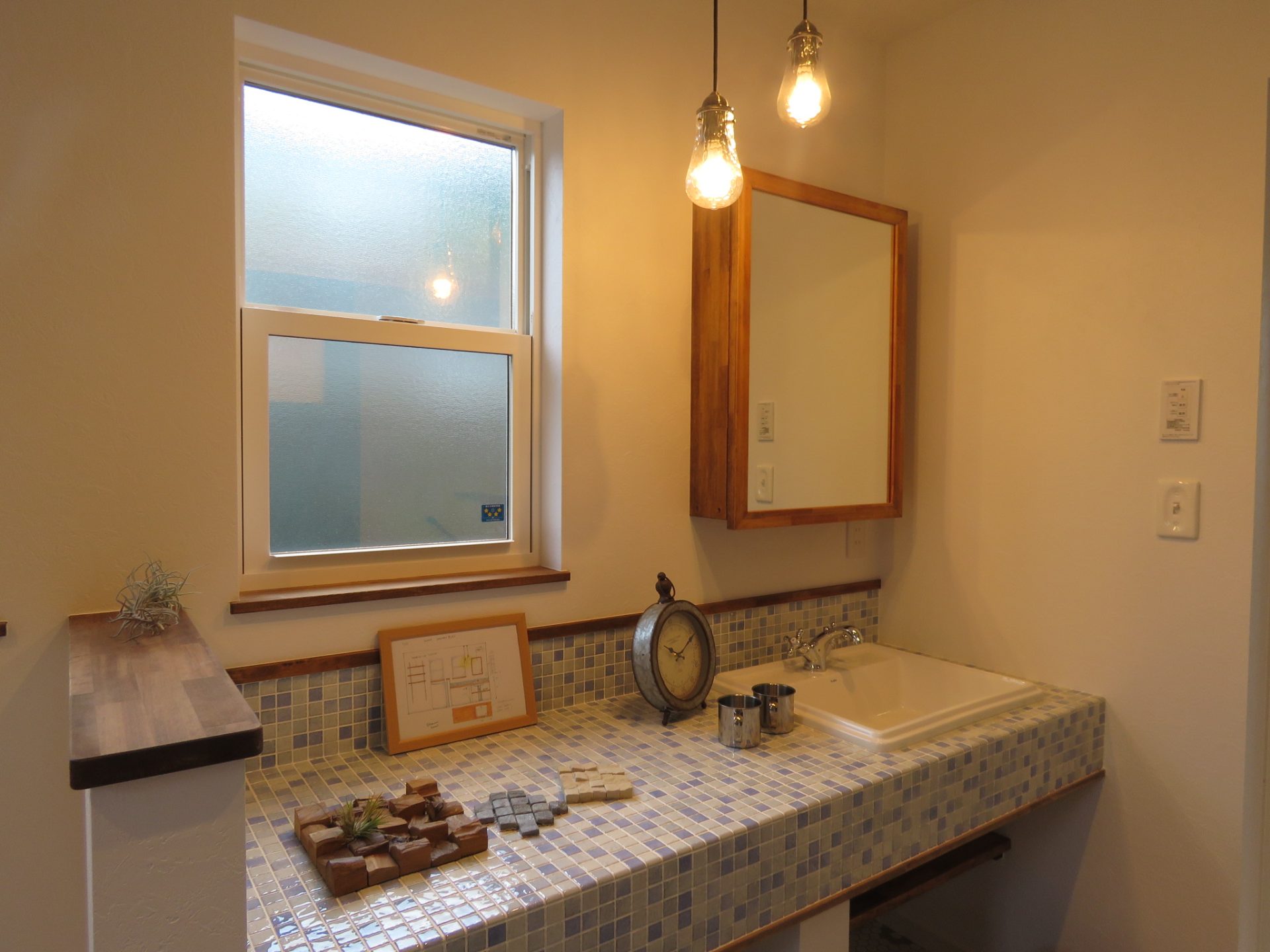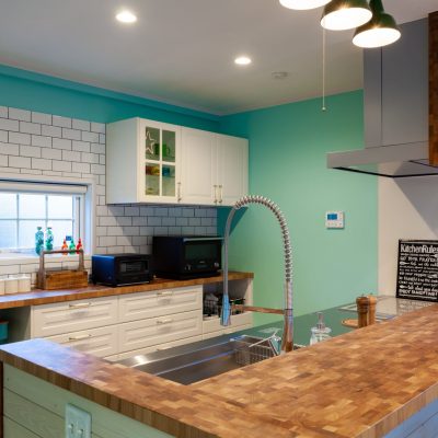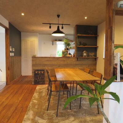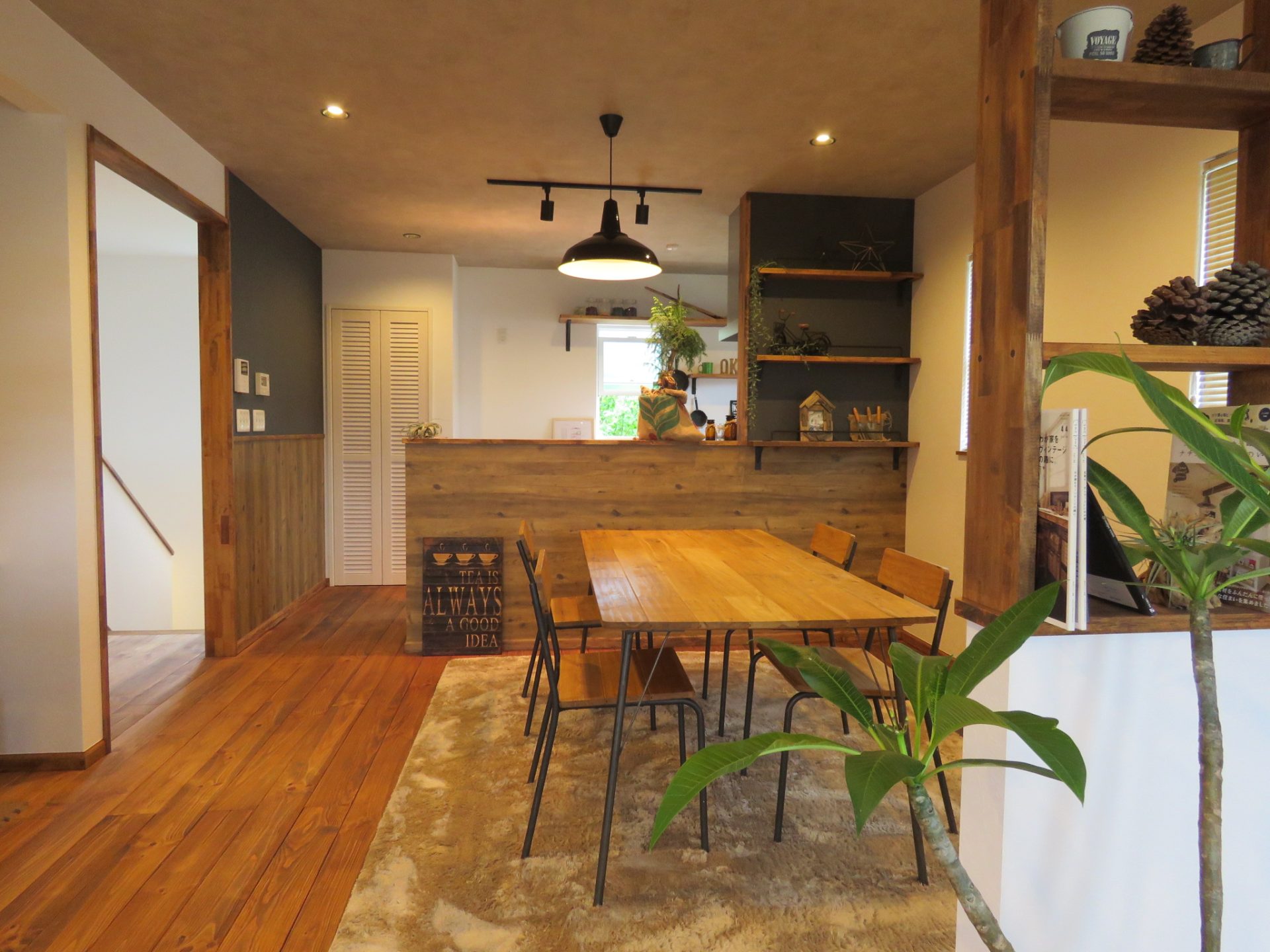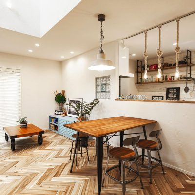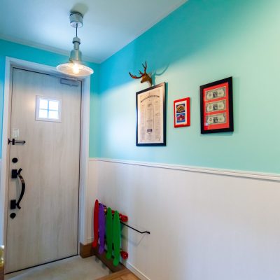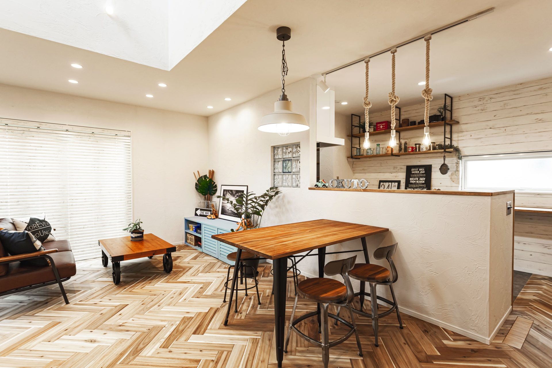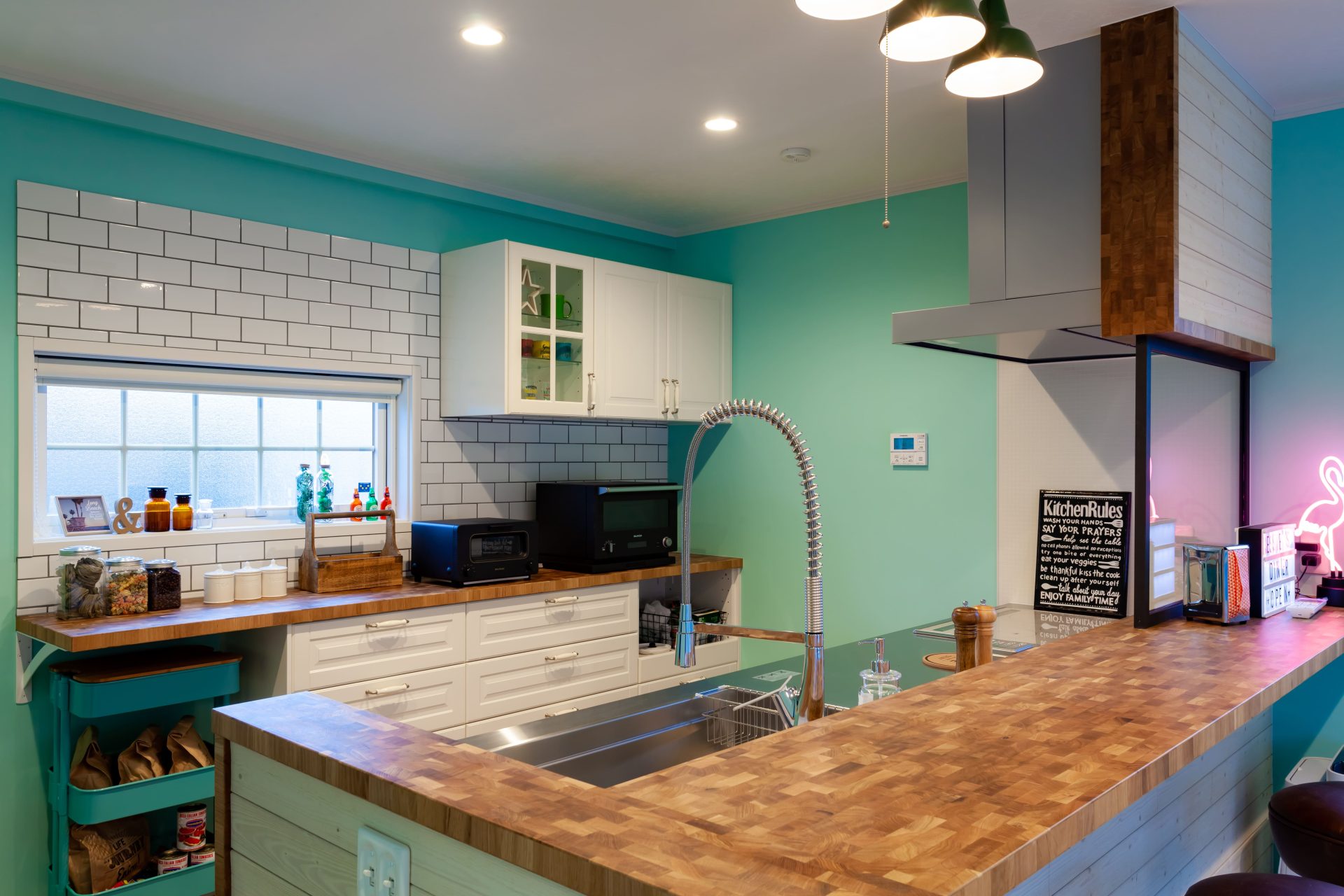 こだわりBlueのラップサイディングに白いカバードポーチが特徴的な外観。お客様ご希望のバイク用インナーガレージがかっこいいアメリカンハウス。バルコニーに繋がる大きな窓とミントブルーの壁で明るく開放的な2階LDK。大好きなアメリカンアイテムでコーディネートして自分たちだけのお気に入りの空間に。