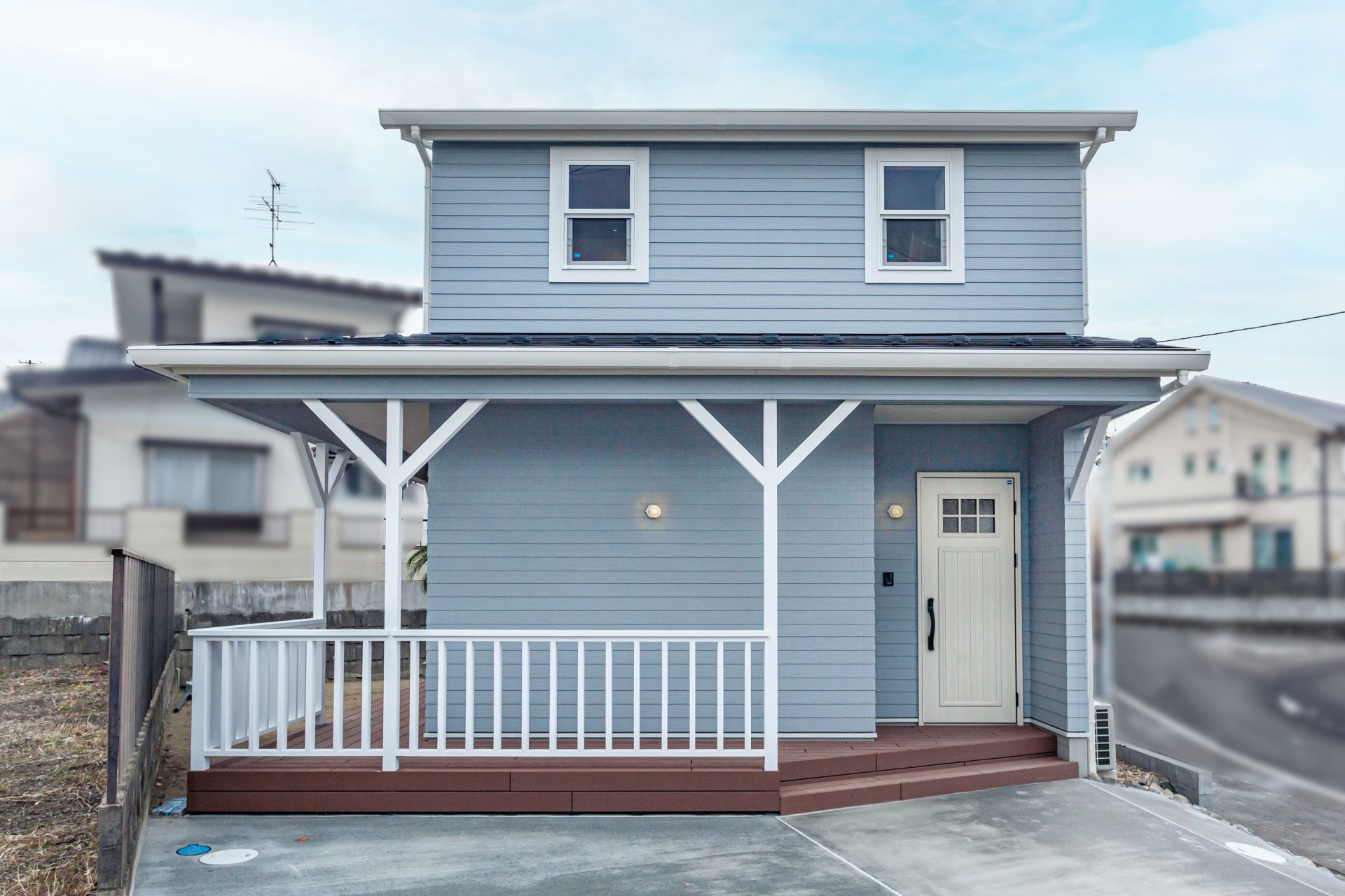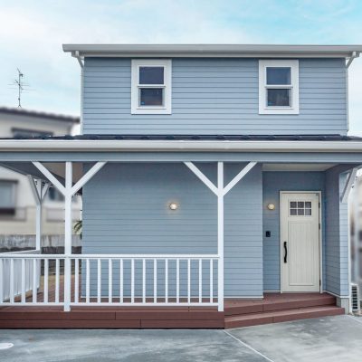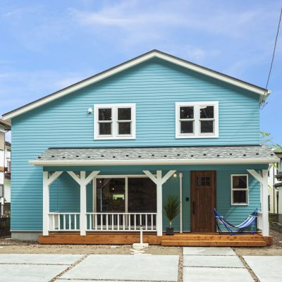 ブルーのラップサイディングに白い枠の格子窓、白い柱のカバードポーチとドア。こだわりのアメリカンな外観が目を引きます。