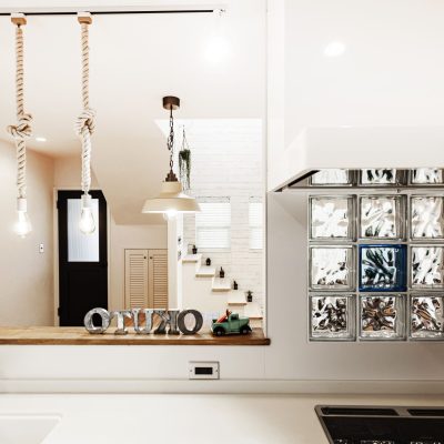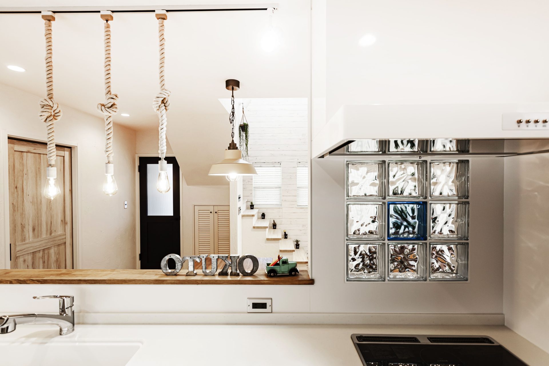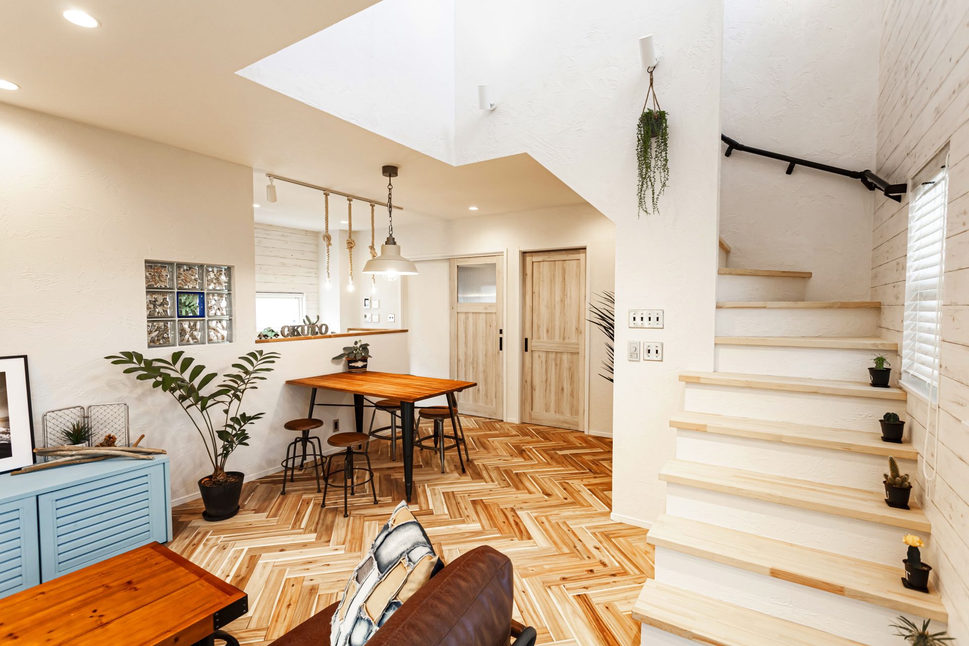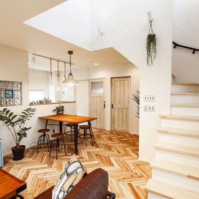 白のラップサイディングとカバードポーチの外観。カリフォルニアスタイルにはかかせないヘリンボーンの床と明るい光が降り注ぐ吹抜けのあるリビング。漆喰の塗り壁には、施主様リクエストのガラスブロックを取り入れました。