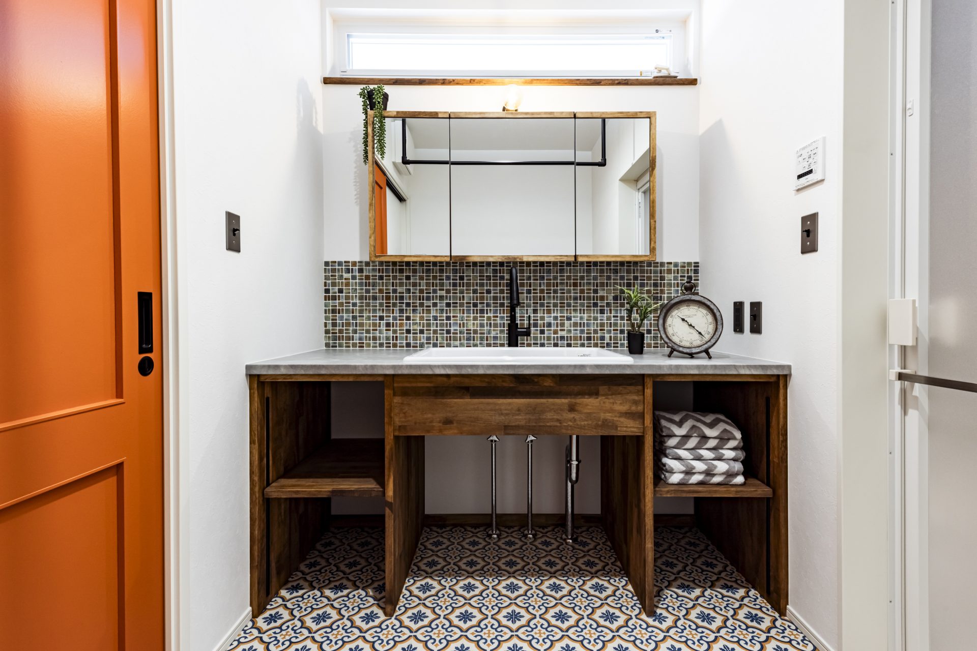 デザインタイルにアクセントカラーのドア、三面鏡の広々洗面台
