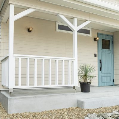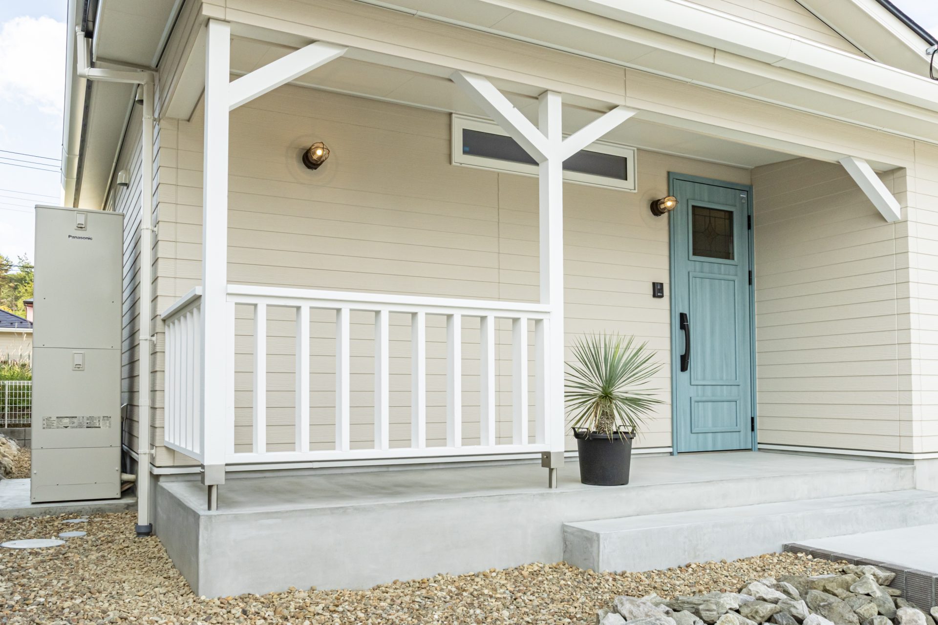 カリフォルニアデザイン特有のオシャレなカバードポーチと、爽やかなブルーの玄関ドア目を惹く外観、車3台分の広い駐車スペースとロックガーデンも可能なカッコいい外構が家を惹き立てます。