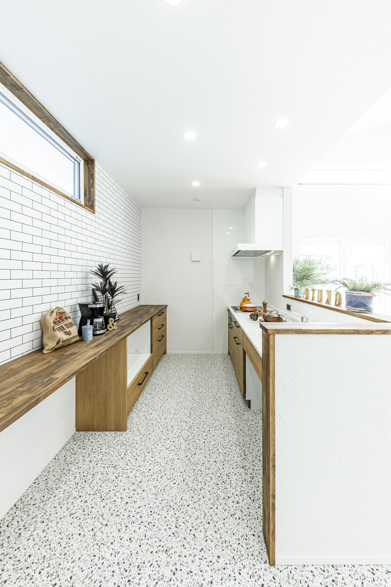 頭上の梁見せの勾配天井はよりリビングを広く感じることができ、リビングからキッチンまで視線がまっすぐ抜ける設計で、家事をしながらでも家族の様子が見れるようになっています。